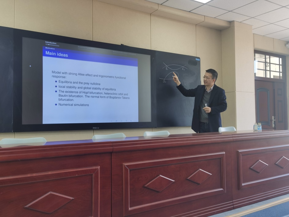 徐教授的报告首先讲述了引入强Allee效应的动机,其次分析了该模型的平衡点,并研究了平衡点的局部稳定性和全局稳定性。进而,根据被捕食者的承载能力的变化来确定可能的分支,给出确定的Hopf分支临界性的解析表达式,并证明了由此产生的Hopf分支是超临界或亚临界的。同时还证明了异宿轨道和Bautin分支的存在性,给出Bogdanov-Takens的正规形式。最后,通过数值模拟与不具有强Allee效应的模型从三个方面进行了对比。