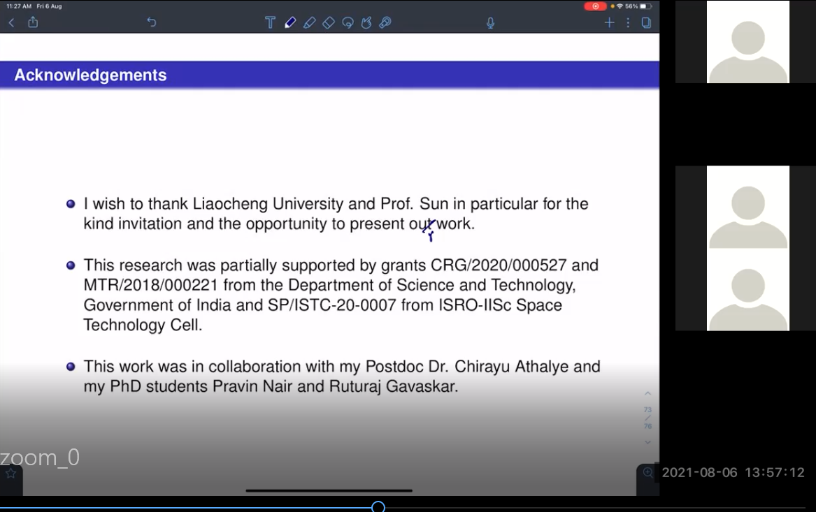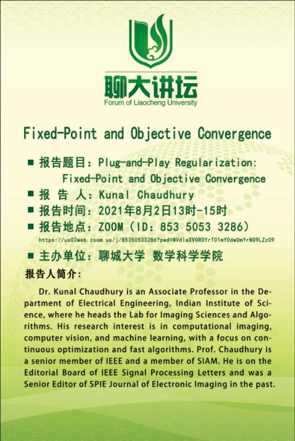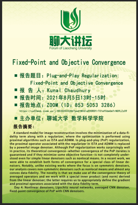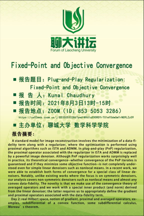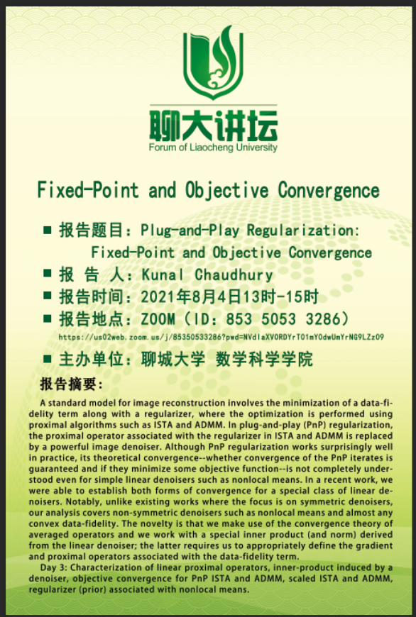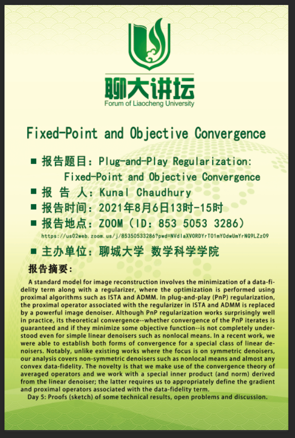 2021年8月2日-6日,印度科技学院Kunal Narayan Chaudhury 教授应邀与喷水 师生开展线上学术交流,并就“PnP正则化的不动点收敛问题“进行了5个系列学术报告。学院部分研究生与教师参加。Chaudhury 博士关于图像处理的精彩报告引起师生们的热烈反响与好评。