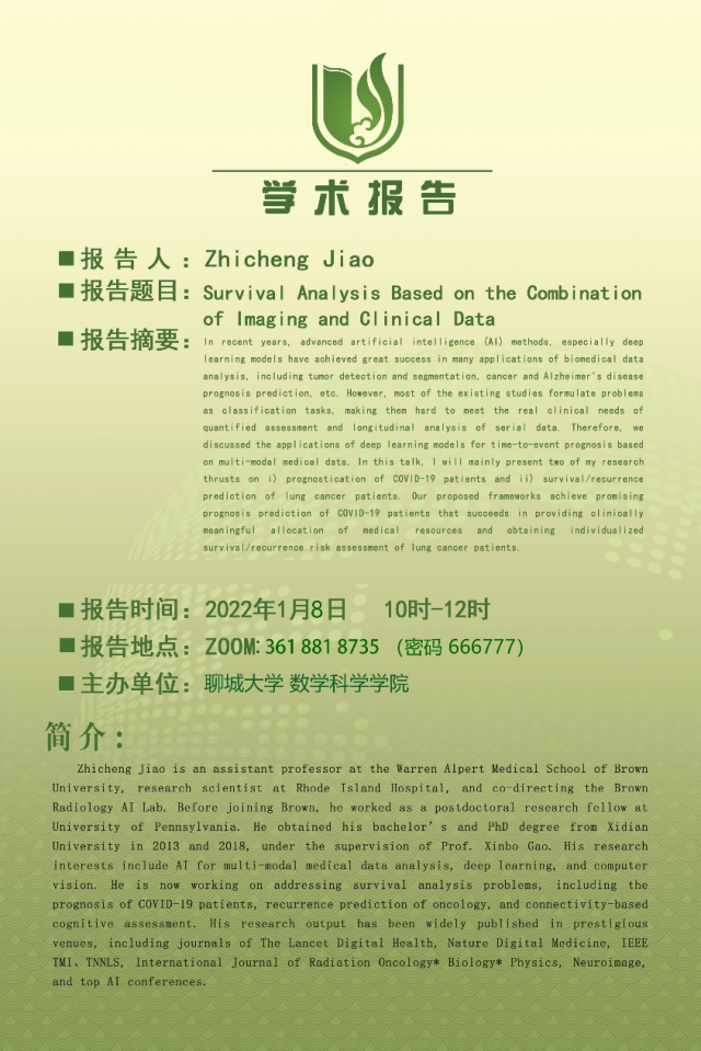 焦志成,布朗大学Warren Alpert医学院助理教授,罗得岛医院研究科学家,影像AI实验室主任,此前曾在宾夕法尼亚大学生物医学图像计算中心(CBICA)担任博士后研究员。分别于2013年和2018年在西安电子科技大学获工学学士、博士学位。他的研究兴趣主要包括基于人工智能方法的多模态医学数据分析、深度学习以及其在计算机视觉上的应用。他目前主要从事基于影像和临床数据的病人预后分析(COVID-19等),肿瘤病人复发预测和人机协同的计算机辅助检测与诊断。他的研究成果已广泛发表在The Lancet Digital Health, Nature Digital Medicine, IEEE Transactions on Medical Imaging、IEEE Transactions on Neural Networks and Learning Systems, International Journal of Radiation Oncology* Biology* Physics, Neuroimage等著名期刊和Top人工智能会议。