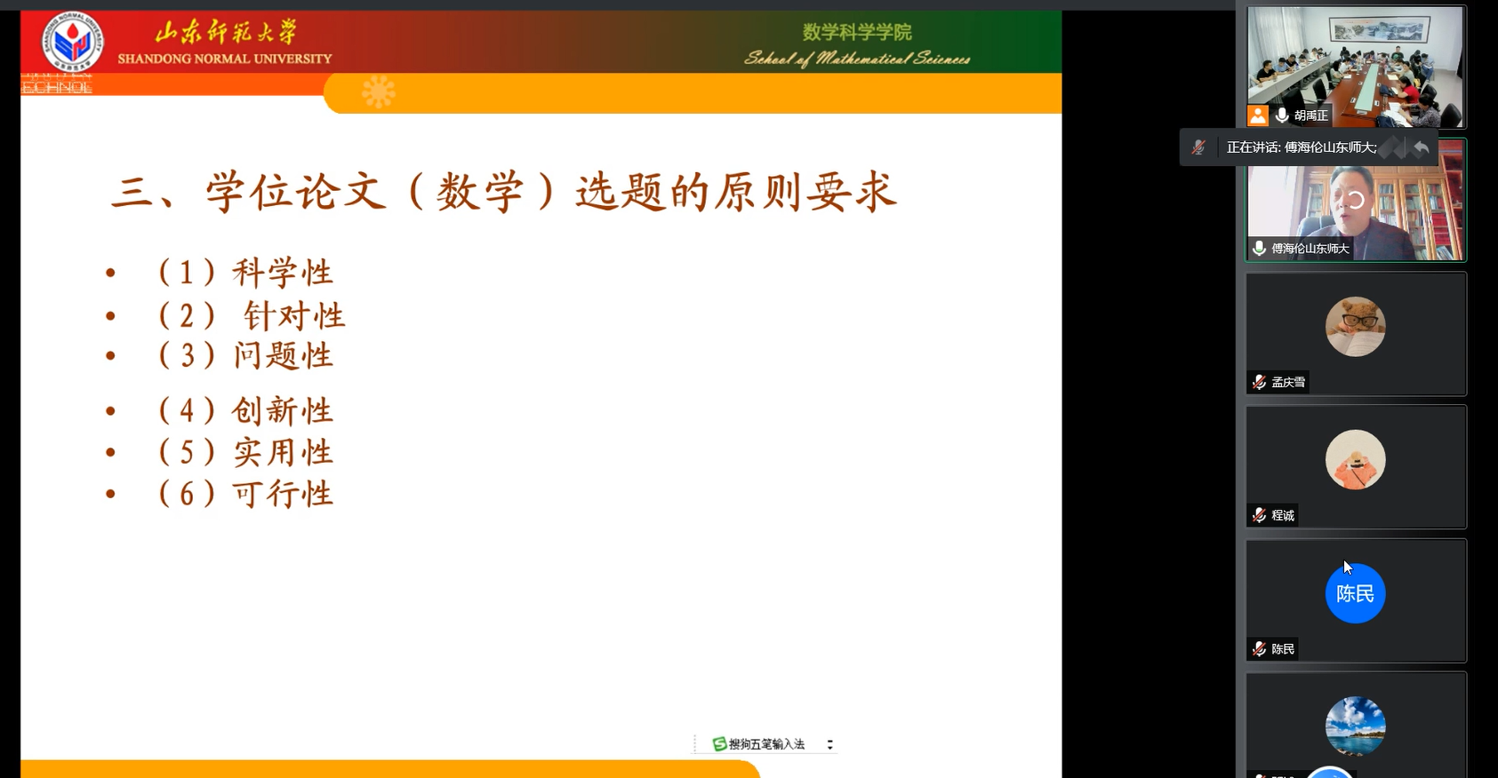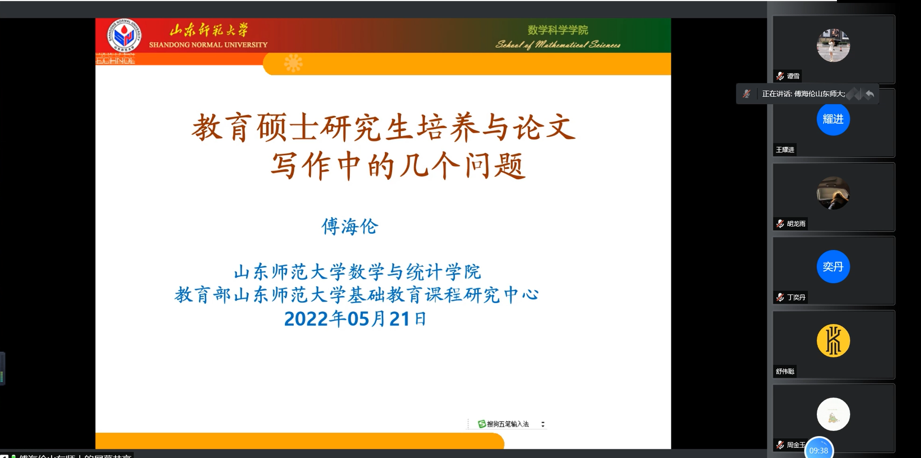 2022年5月20日下午14:30,受喷水 邀请,山东师范大学傅海伦教授对学科教学(数学)硕士研究生论文写作中注意的问题进行了在线指导,并对当前的教育研究热点进行了深入讨论和交流。本次学术交流活动以腾讯会议的形式举行,由房元霞教授主持,喷水 部分教师、学科教学(数学)研究生和聊城市部分中学教师参与了本次学术活动。