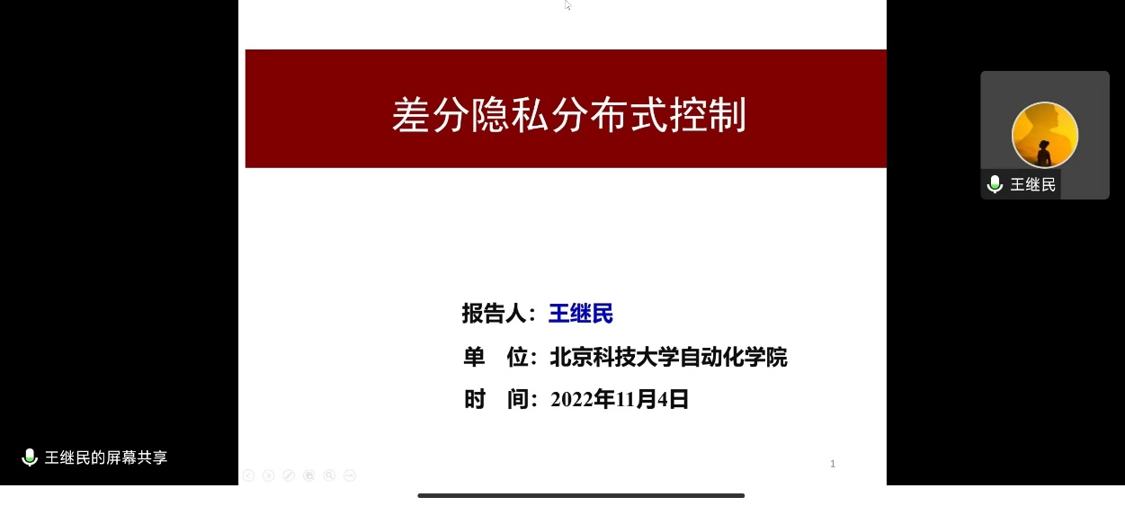 2022年11月4日(星期五)晚上19:00,喷水 邀请北京科技大学自动化学院王继民副教授作了题为“差分隐私分布式控制”的报告。本次报告以腾讯会议的形式举行,由陈国梁老师主持,喷水 相关专业老师和研究生在11号教学楼B207参加了本次报告。