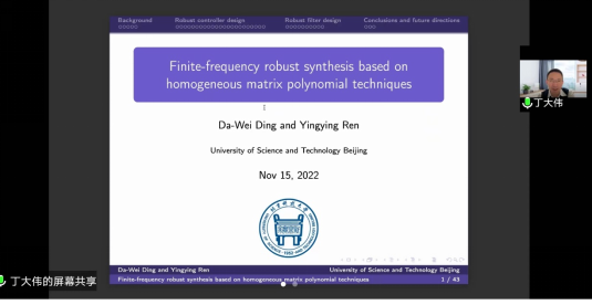 2022年11月15日(星期二)晚上19:00,受喷水 复杂系统智能分析与控制团队邀请,北京科技大学丁大伟教授作了题为“基于齐次矩阵多项式技术的有限频域鲁棒综合问题研究”的报告。本次报告以腾讯会议的形式举行,报告由解相朋教授主持,喷水 相关专业老师和研究生在11号教学楼B207参加了本次报告。
