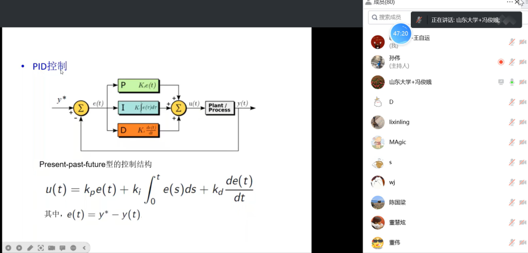 2022年11月25日(星期五)晚上19:00,受智能分析与优化控制创新团队邀请,山东大学冯俊娥教授作了题为“控制系统的初步认识”的报告。本次报告以腾讯会议的形式举行,由喷水 孙伟副教授主持,智能分析与优化控制创新团队的老师和研究生在线上参加了本次报告会。