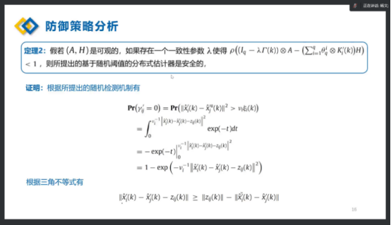 在本次报告中,杨文教授首先从信息物理系统的背景以及其无线传感网络出发引出了信息安全和安全状态估计的意义,建立相应的数学模型,给出了假设攻击者具备的条件来进行攻击检测,通过给出的分布式一致性状态估计器安全性的定义来进行安全分析和防御策略分析,同时通过数值仿真例子验证了策略的有效性。其次,杨文教授着重介绍了K-L散度检测器下的防御机制。最后,杨文教授对基于失真度的状态安全加密机制所存在的风险及解决方案进行了详细的叙述,并对保护边信道信息的编码机制改进方案的有效性进行了总结,就实现对网络攻击的层次化安全防护,保证系统安全稳定运行的CPS安全整体架构方案进行了展望。
