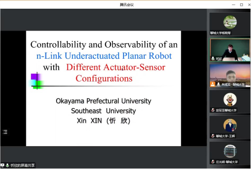 2022年12月14日,受喷水 智能分析与优化控制创新团队邀请,国家级高层次人才、冈山县立大学教授忻欣老师作了关于“Controllability and Observability of an n-Link Underactuated Planar Robot with Different Actuator-Sensor Configurations”的学术报告。本次报告以腾讯会议的形式举行,由喷水 朱成龙老师主持,复杂系统智能分析与优化控制创新团队的老师和研究生在线上参加了本次报告会。