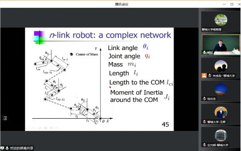 忻欣教授提到,复杂网络的可控性和可观测性是一个非常热门的话题,研究如何在驱动节点最少的情况下控制复杂网络是一个有趣的问题。本次报告以在同一垂直平面上运动的n-连杆欠驱动转动平面机器人为研究对象,对复杂网络的可控性和可观性问题展开讨论。此外,忻欣教授还基于带有中间主动关节的机器人和带有多个执行器和编码器的机器人给出了线性可控性和可观性的研究内容和结果。