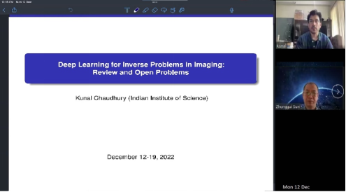 应喷水 和国际合作交流处邀请,印度科技学院Kunal Narayan Chaudhury 教授于2022年12月12日-19日,通过ZOOM开展线上学术交流,就“深度学习在计算机视觉反问题中的应用“进行了5个系列学术报告。报告由孙忠贵教授主持,喷水 、计算机学院和农学院的部分研究生与教师参加。
