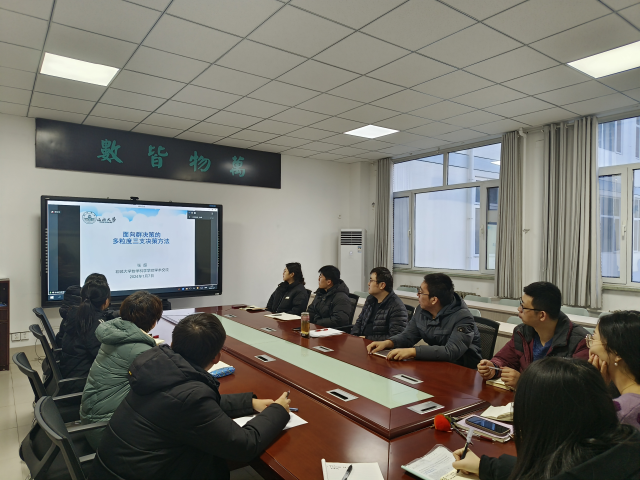 2024年1日7日,受喷水 邀请,山西大学张超教授和苏州科技大学苏勇教授分别作了题为“面向群决策的多粒度三支决策方法”和“分配性与条件分配性:回顾与展望”的学术报告。此次报告由喷水 李令强教授主持,不确定理论团队相关专业老师和研究生在11号教学楼B207参加了本次报告会。