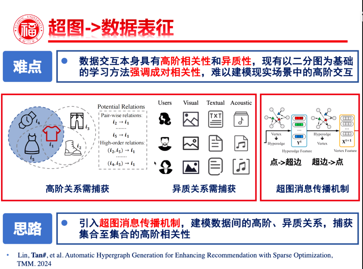 在此次报告中,檀彦超老师分享了一种使用图技术框架建立的可解释的服务推荐方法。该技术采用了无监督聚类超图结构构建以及集合到集合的超图卷积来实现高阶节点表征,从而提高模型推荐性能。同时,采用对比学习+推荐模块进行联合优化,使得模型的推荐结果更加准确。然而,在真实场景中,服务数据往往易于缺失,模态特征也不完备,这使得模型的泛化能力有限。为此,引入了特征补全机制,包括同类模态相互补全和不同模态对齐补全,以在数据缺失的情况下获取最优化的推荐结果。这一方法为服务推荐提供了全新的思路,并且对实际应用场景有着重要的指导意义。