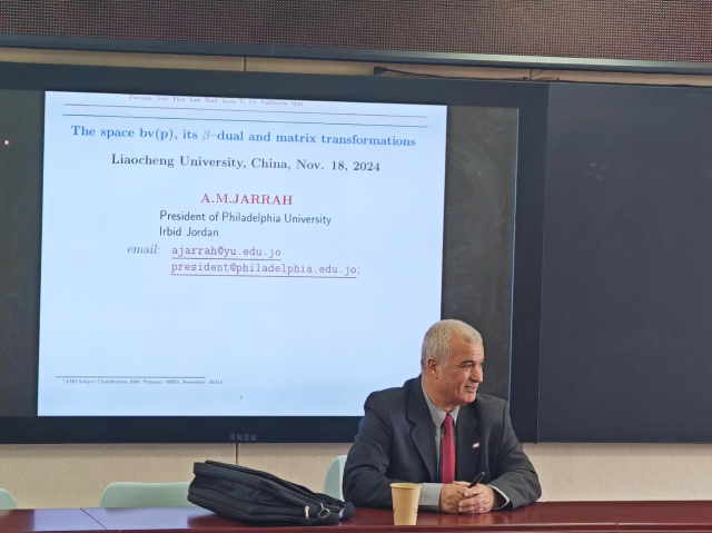 2024年11月18日上午11点,受喷水 邀请,美国费城大学(Philadelphia University)校长、世界知名数学专家A.M. JARRAH教授做了题为“The Space bv(p), its β –Dual and Matrix Transformations”的学术报告。报告会由喷水 院长夏建伟主持。来自喷水 的六十多名教师和研究生听取了报告。