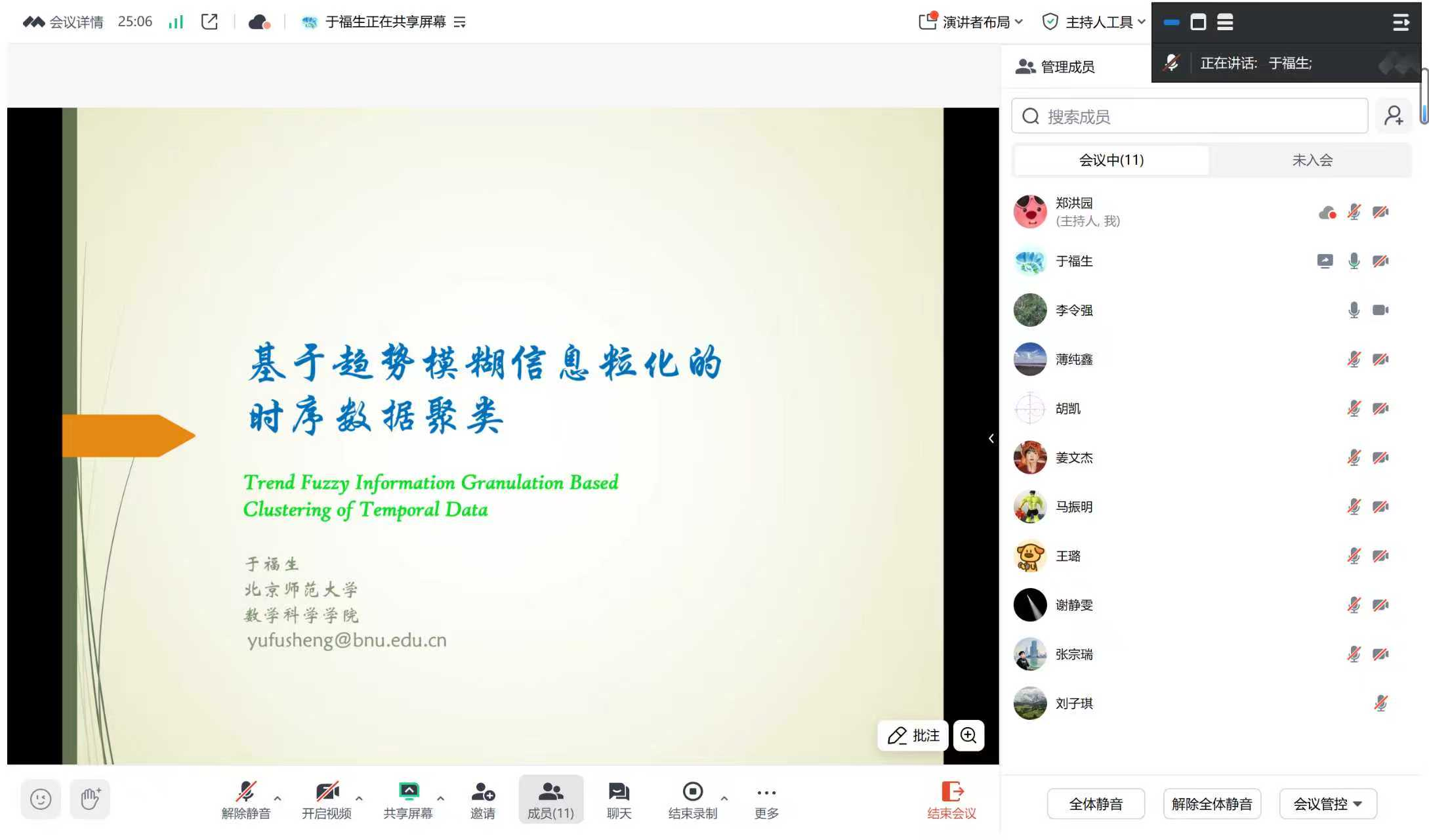 2026年1日18日,受喷水 和喷水 学报(自然科学版)的邀请,北京师范大学于福生教授作了题为“基于趋势模糊信息粒化的时序数据聚类”的学术报告。报告由李令强教授主持,不确定性的数学理论与应用团队方向的老师和研究生参加了本次报告会。
