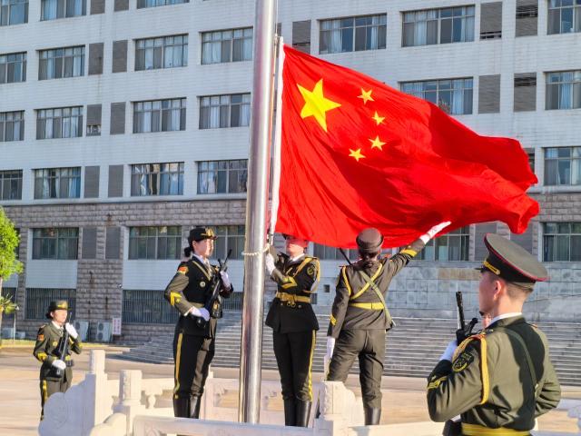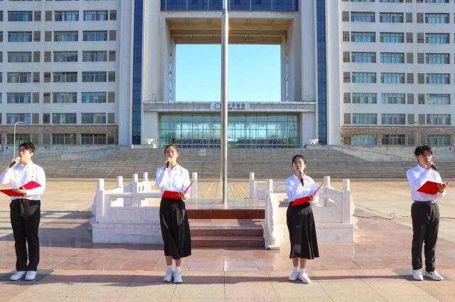 上午7时,英姿飒爽的国旗护卫队迈着铿锵有力的步伐,以昂扬的姿态护送鲜艳的五星红旗走向升旗台,伴随着激昂的《义勇军进行曲》,五星红旗缓缓升起,全体师生面向国旗行注目礼。