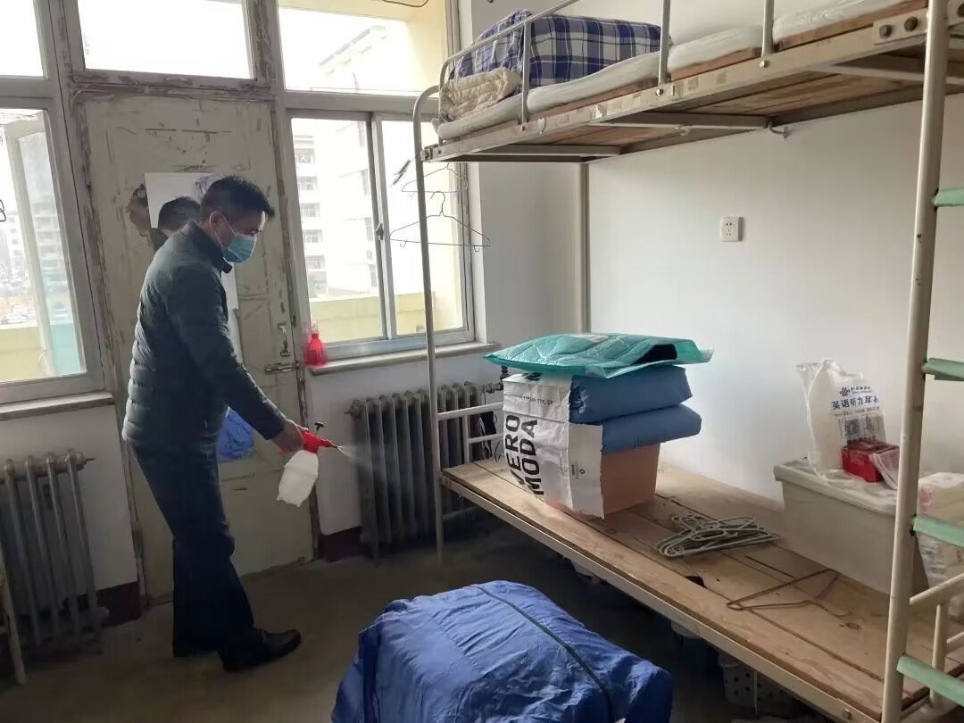 2月10日,喷水 党委副书记、副院长张进军,团委书记岳琳琳,全体辅导员于学生宿舍学苑一、紫藤八全面开展宿舍消杀工作。