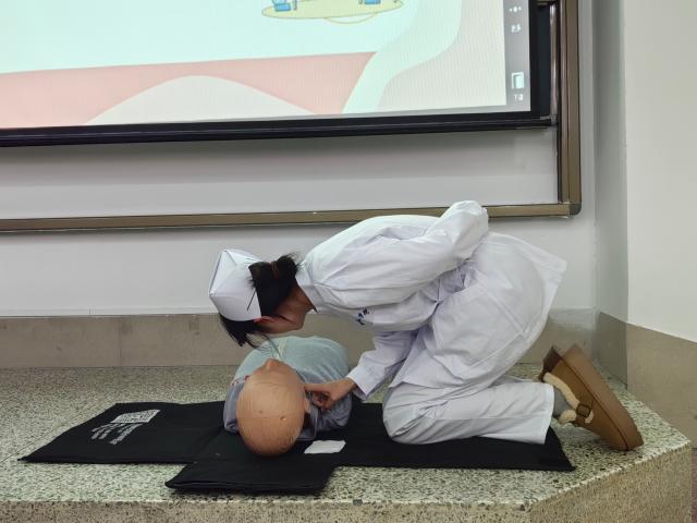 活动伊始,主讲人通过视频和PPT的形式详细讲解心肺复苏的正确步骤和标准的按压手法,讲解过程中,主讲人对现场学生进行简单急救知识提问,了解学生对急救知识的掌握情况。随后,主讲人讲解海姆立克急救法,介绍气道堵塞发生的原因、表现以及应对此问题的正确处理方法,队员进行现场演示。上台操作环节,队员利用假人模拟心脏复苏急救现场,从迅速判断现场环境是否安全,到准确判断患者有无意识、呼吸,再到标准规范的胸外按压手法,对各环节的操作流程和技术要领进行分步讲解和示范。实操练习过程中,学生积极踊跃上前操作,队员全程在旁悉心指导,及时纠正同学们操作中的错误,确保大家能更好掌握这一救命技能。