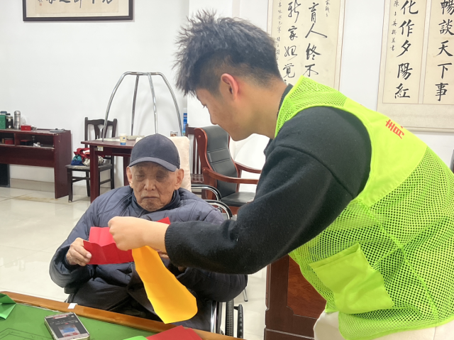 活动开始时,志愿者们将精心准备的彩纸、丝线、剪刀等材料整齐摆放,向老人们介绍“非遗翻花”和中国结的历史渊源和文化内涵。随后,志愿者热情邀请大家围坐创作,手把手教授手工艺技巧。在制作“非遗翻花”过程中,他们细致讲解每一步,从折叠、剪裁到组装成型;制作中国结时,一边演示复杂的编织方法,一边分享吉祥寓意,耐心指导手法和角度。在欢乐的氛围中,一个个精美的翻花和中国结逐渐完成。