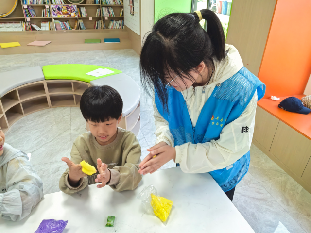 在“夏日节气趣谈”环节中,志愿者借助精心准备的动画和PPT,绘声绘色地为孩子们讲述立夏、小满等夏日节气故事。互动问答阶段,孩子们踊跃举手,积极回答围绕夏日节气提出的相关问题,现场气氛热烈融洽。“夏日数字配对”游戏巧妙结合夏日元素设计数字卡片,孩子们在趣味游戏中完成数字匹配,有效锻炼观察力和数学认知能力。志愿者们以寓教于乐的方式,将数学知识融入夏日游戏,带领孩子们在实践探索中收获知识与快乐。随后开展粘土趣作和海报绘制环节,在志愿者的帮助下,孩子们化身小小艺术家,用创意粘土捏出西瓜、柠檬等夏日元素,同时将对夏天的喜爱融入画笔,一幅幅充满童趣的海报应运而生,充分体现了他们的想象力和创造力。