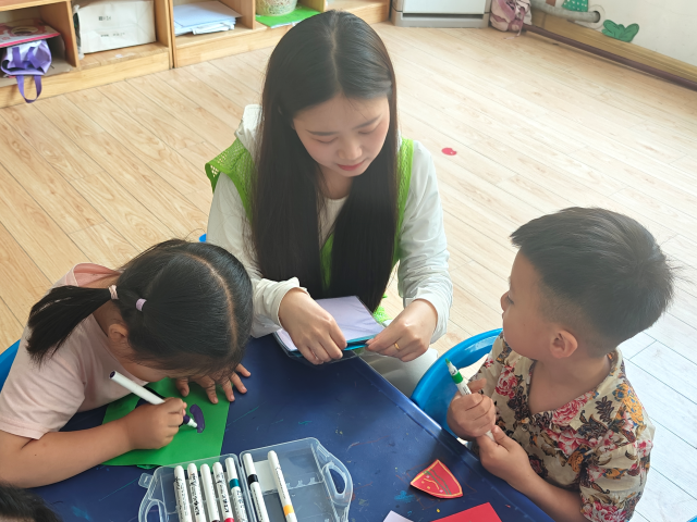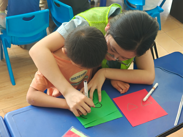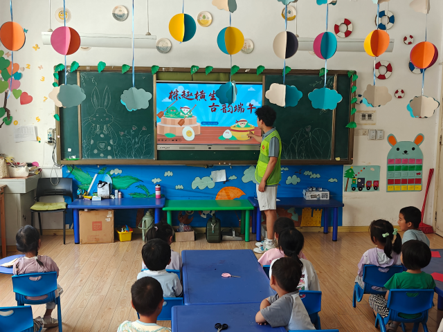 志愿者以生动的PPT为孩子们打开端午节文化的大门,从屈原的爱国故事到“赛龙舟”“包粽子”“挂艾草”等传统习俗,从节气文化到民间传说,他们用通俗易懂的语言和鲜活的图片,让孩子们在趣味互动中深入了解端午节起源与文化内涵。孩子们积极举手提问,现场气氛热烈,传统文化的种子在欢声笑语中悄然播撒。在手工制作环节中,志愿者分发彩色卡纸、安全剪刀、胶水等材料,带领孩子们制作“不倒翁”粽子龙舟,他们化身“小小设计师”,通过裁剪、折叠、粘贴等方式,将一个个“粽子”造型粘贴在龙舟模型上。志愿者们穿梭其间,或协助调整结构,或鼓励创意表达,在他们的耐心指导下,一个个的“粽子龙舟”陆续诞生,孩子们捧着成果兴奋展示,眼中闪烁着创意与成就感的光芒。