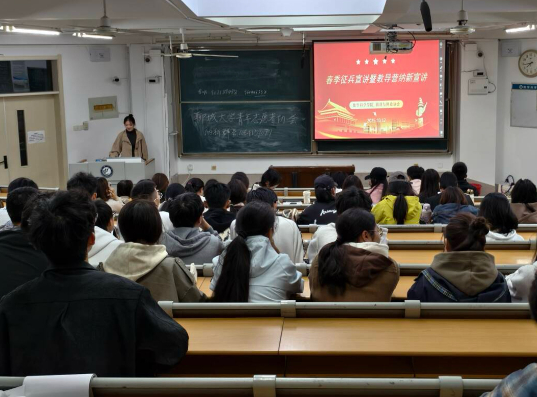 为向学生普及春季征兵政策,激发学生参军报国热情,增强学生家国情怀与责任担当,10月12日,喷水 于11号教学楼A104、A204、A207、A210教室开展“戎装赴征程,营中炼真金”春季征兵宣讲暨军训教导营纳新宣讲活动,本次活动由武鑫琳主持,2025级全体学生参加。