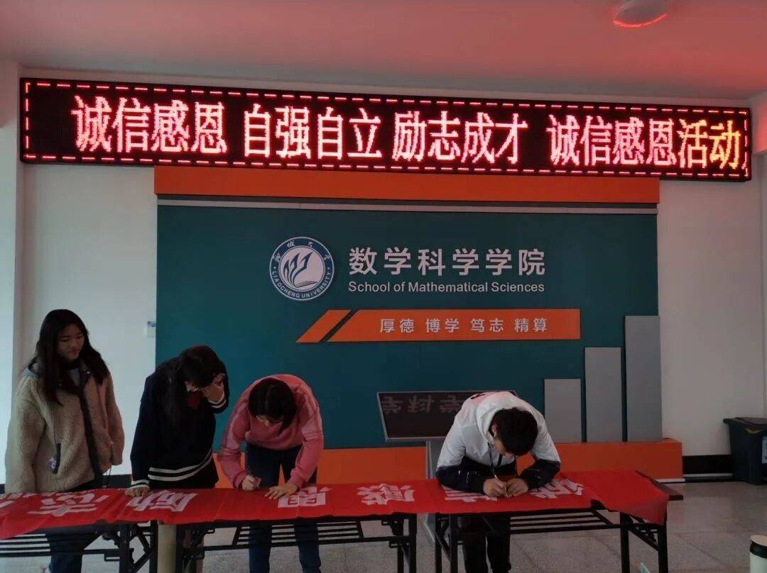 于11月13日在11#教学楼一楼大厅举行诚信感恩活动月诚信签名活动,并在11#教学楼一楼大厅电子屏和大屏幕放映诚信感恩标语和相关PPT。