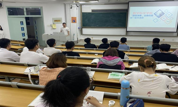 为使广大同学树立理性消费的观念,时刻保持清醒,远离各类诈骗行为,喷水 于2021年5月15 日和5月16日在西校11教学楼A204教室组织举办“理性消费,远离校园贷”主题征文比赛和金融安全平面设计类作品征集活动,通过征集观看视频后的心得体会,用文字和图像形式表达自己对校园贷的认识及深刻体会,让同学们意识到树立正确消费观,远离校园贷,形成良好消费习惯的重要性。