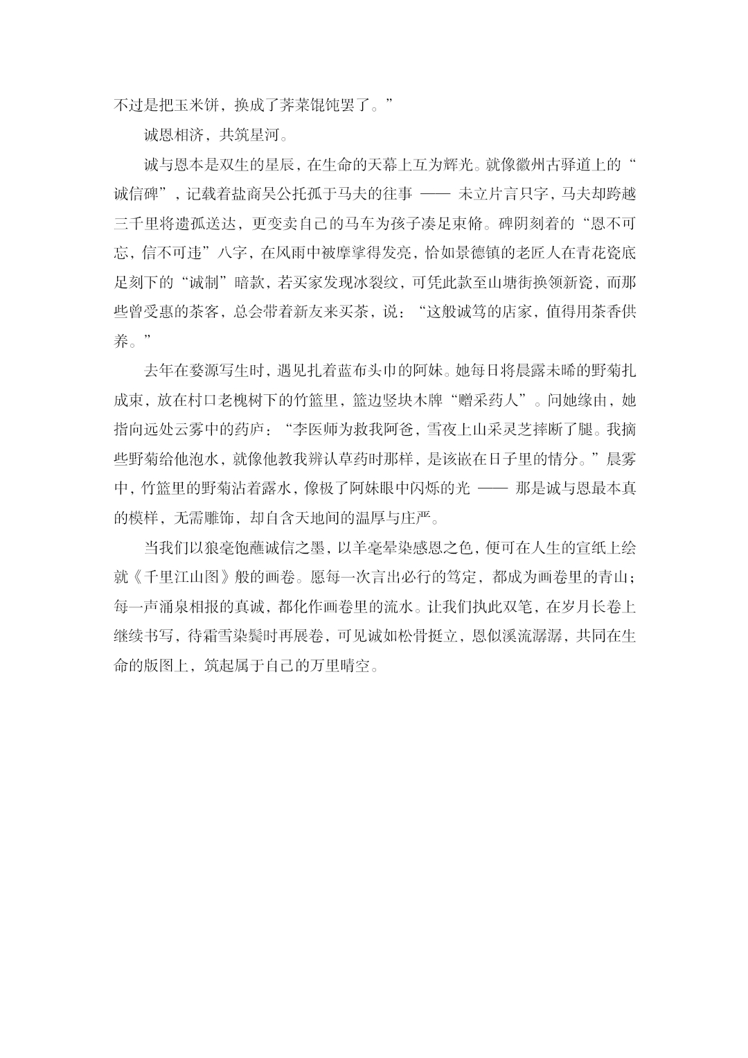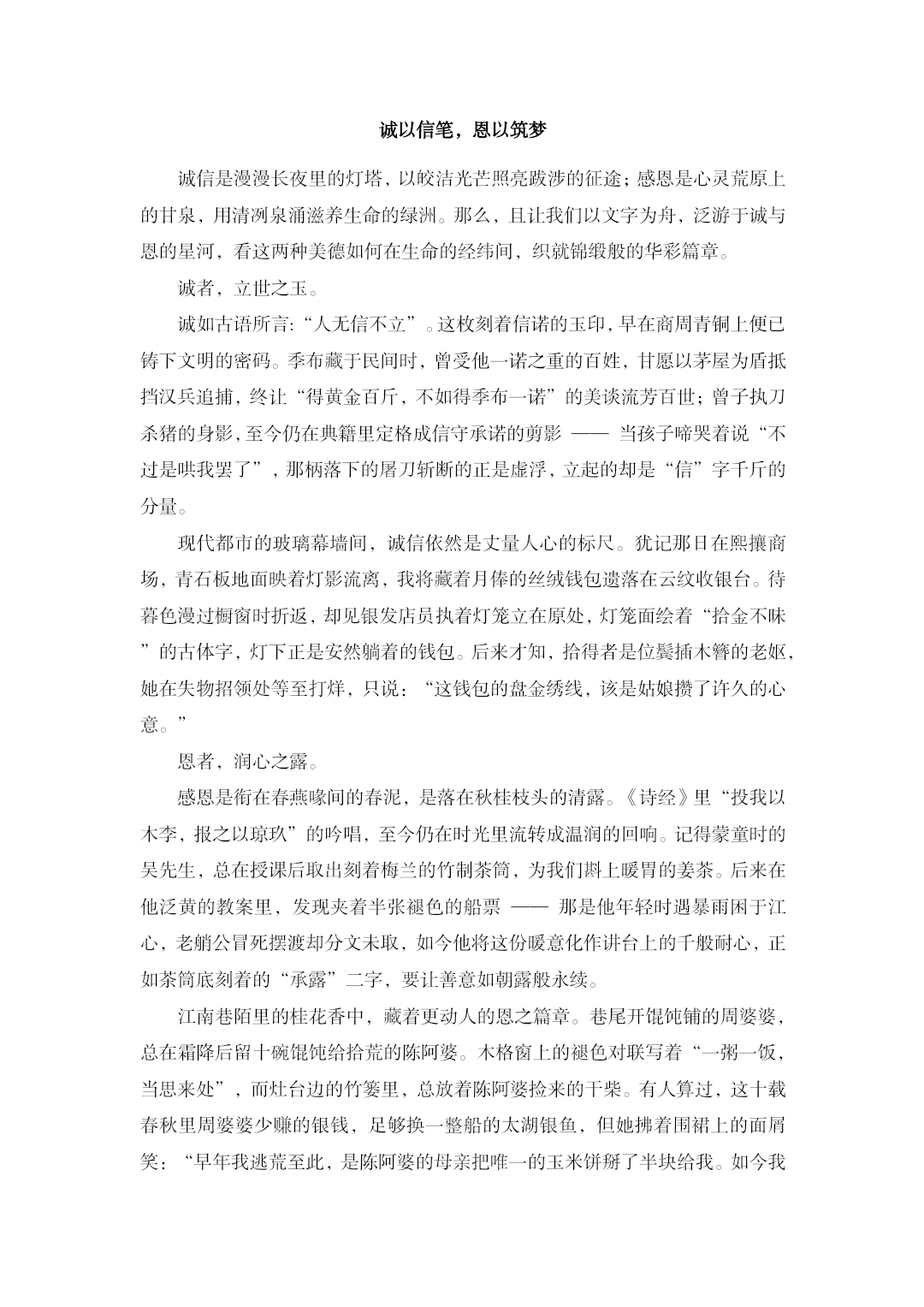 此次活动鼓励学生以“诚信为基,感恩筑梦”为创作理念,围绕诚信故事、感恩情怀及价值内涵展开征文创作。活动期间,同学们充分调动创造力,从纪实风格的诚信人物速写,到抒情散文式的感恩书信,从跌宕起伏的诚信主题微小说,到富含哲思的感恩诗歌,让诚信与感恩的精神内核跃然纸上,焕发出两者的精神内核。同学们以多元的体裁展现主题内涵,创作出一篇篇情真意切的征文作品,那些被文字记录的故事,不仅呈现了诚信感恩的日常实践,还促进了学生对社会主义核心价值观中诚信与感恩维度的认知与认同。最终,评委依据作品的主题契合度、情感真挚度、表达创新度等多重维度综合评审,评选出一批兼具思想性与艺术性的优秀作品。