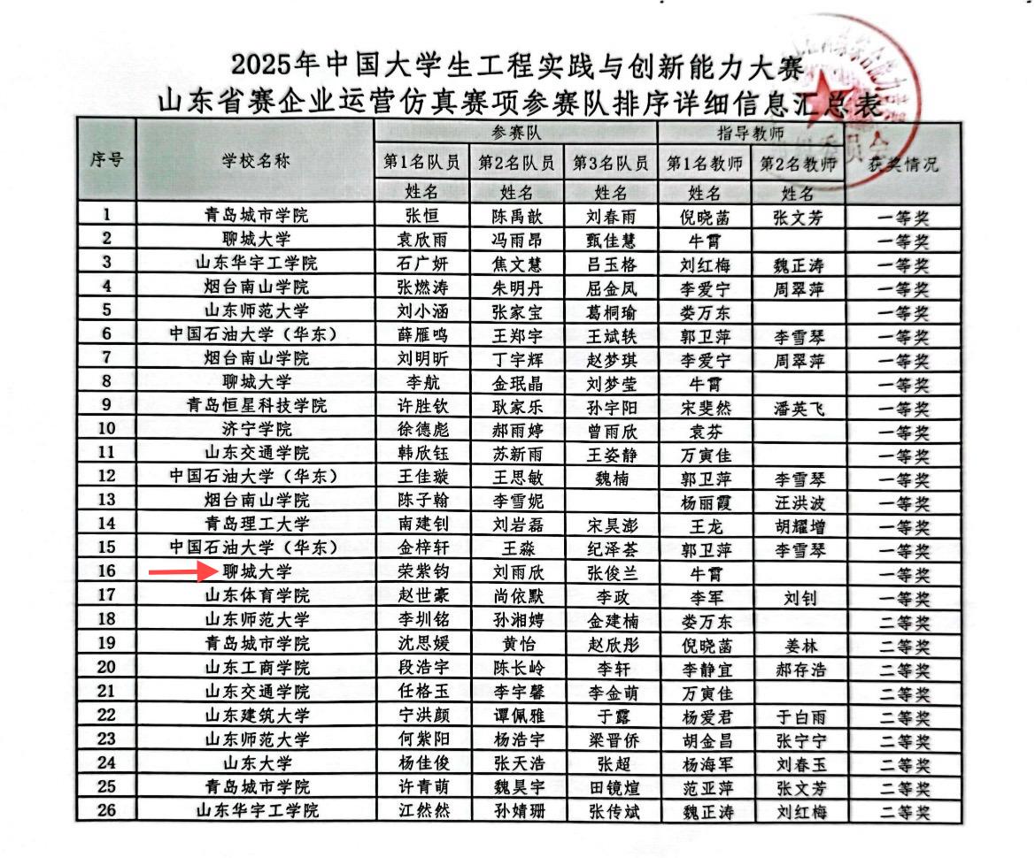 近日,2025年山东省大学生工程实践与创新能力大赛暨2025年中国大学生工程实践与创新能力大赛选拔赛在中国海洋大学(崂山校区)圆满落幕。喷水 代表队凭借出色的表现,在2025年中国大学生工程实践与创新能力大赛山东省赛企业运营仿真赛项中斩获一等奖。