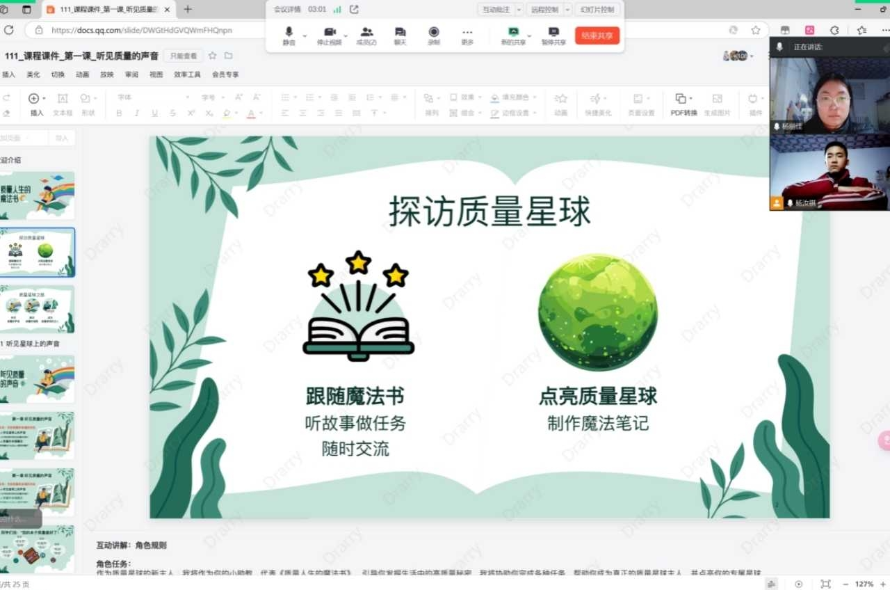 在这次授课经历中,我深知自己不仅是一位知识的传递者,更是他人成长道路上的引路人。我精心准备课程内容,希望帮助小朋友理解高质量人生的意义,绘制出一本属于他自己的《质量人生的魔法书》。