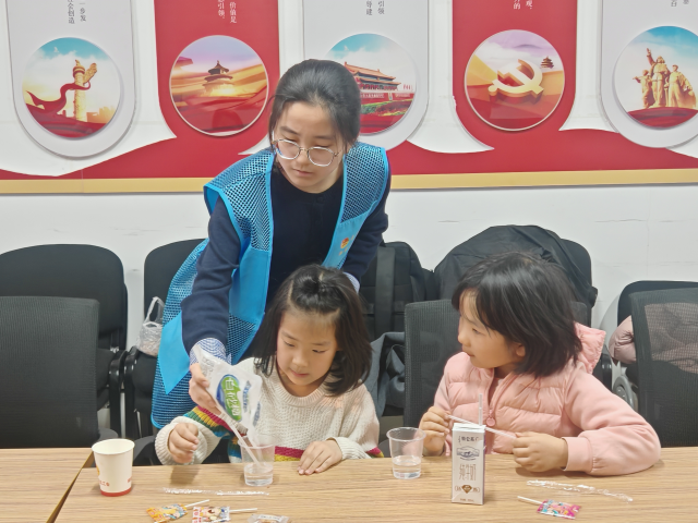 活动伊始,志愿者们通过精心制作的PPT,以生动有趣的语言讲解生活中的科学现象,将水的表面张力、空气压力等复杂原理化作一个个浅显易懂的小故事,成功吸引了在场每一位小朋友的注意力。在“火山喷发”“牛奶画布”“不会湿的纸团”等互动实验中,志愿者们鼓励孩子们亲自动手操作,通过观察和思考,探索这些奇妙现象背后的科学奥秘。孩子们兴致勃勃,跃跃欲试,小小的课堂充满了欢声笑语。随后,志愿者们对“彩虹瓶”“简易电动机”等创意作品详细讲解了制作过程和科学原理。小朋友们聚精会神地聆听,踊跃提问,现场气氛热烈非凡。活动尾声,全体志愿者与孩子们亲切合影,共同记录下这段充满乐趣与知识的美好时光。