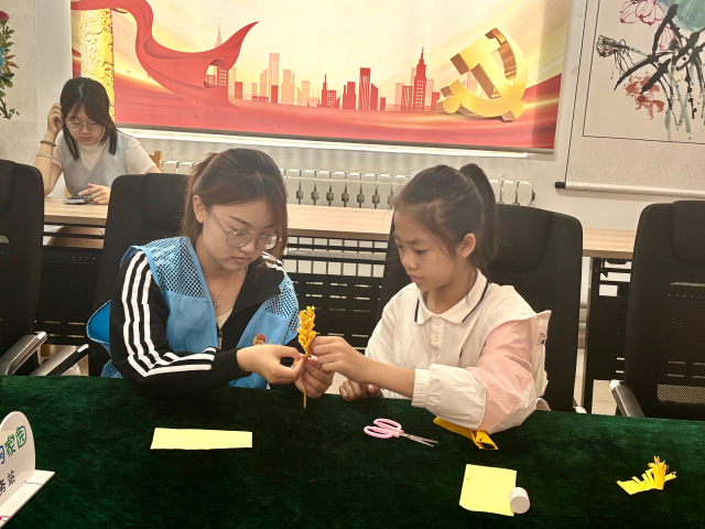 活动伊始,志愿者以动画短片《小满的故事》开启课堂,让孩子们直观感受到古人顺应天时的智慧。知识科普环节,志愿者通过图文并茂的PPT向小朋友们介绍小满的节气特点、哲学内涵等,让他们对小满节气有了初步的了解;问答互动环节,小朋友们积极举手分享自己了解的节气习俗,激发了他们主动探索传统文化的热情;手工创作环节,志愿者手把手地教小朋友们制作“麦穗”,在他们的耐心指导下,小朋友们小心地将金黄色的卡纸剪裁成细长的麦穗形状,仔细地粘贴各个部分,每一个步骤都充满了乐趣。在欢乐的氛围下,一棵棵独一无二的麦穗逐渐成型,让孩子们对“小满未满,麦渐盈实”的自然规律有了更深的理解,实现了传统文化教育与劳动教育的有机融合。