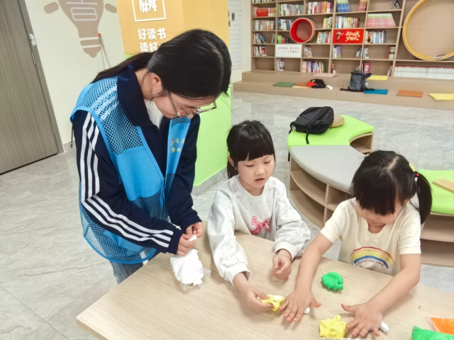 在“夏日节气趣谈”环节中,志愿者借助精心准备的动画和PPT,绘声绘色地为孩子们讲述立夏、小满等夏日节气故事。互动问答阶段,孩子们踊跃举手,积极回答围绕夏日节气提出的相关问题,现场气氛热烈融洽。“夏日数字配对”游戏巧妙结合夏日元素设计数字卡片,孩子们在趣味游戏中完成数字匹配,有效锻炼观察力和数学认知能力。志愿者们以寓教于乐的方式,将数学知识融入夏日游戏,带领孩子们在实践探索中收获知识与快乐。随后开展粘土趣作和海报绘制环节,在志愿者的帮助下,孩子们化身小小艺术家,用创意粘土捏出西瓜、柠檬等夏日元素,同时将对夏天的喜爱融入画笔,一幅幅充满童趣的海报应运而生,充分体现了他们的想象力和创造力。