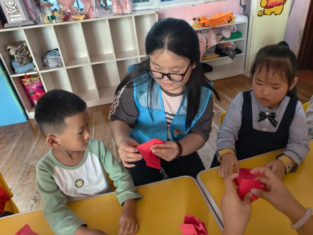 活动伊始,志愿者以“保护大家的英雄”为主题,通过播放烈士事迹视频,搭配生动有趣的语言讲解,让小朋友们初步感受英雄烈士的勇敢精神与奉献情怀。随后,志愿者化身“红色故事讲解员”与“童心陪伴者”,手持绘有英烈小故事的绘本,向小朋友们讲述英雄事迹,并带领小朋友们齐唱改编版的红色童谣,欢快的旋律中传递出崇敬之情。接着,志愿者把提前准备好的彩纸、胶棒等工具分发给小朋友们,并手把手地指导大家制作“小红花”,一朵朵鲜艳的“小红花”,成为小朋友们致敬英雄的专属礼物。最后,小朋友主动分享自己的感受,志愿者们为积极参与的小朋友们送上小奖励,让红色记忆伴着笑容定格。