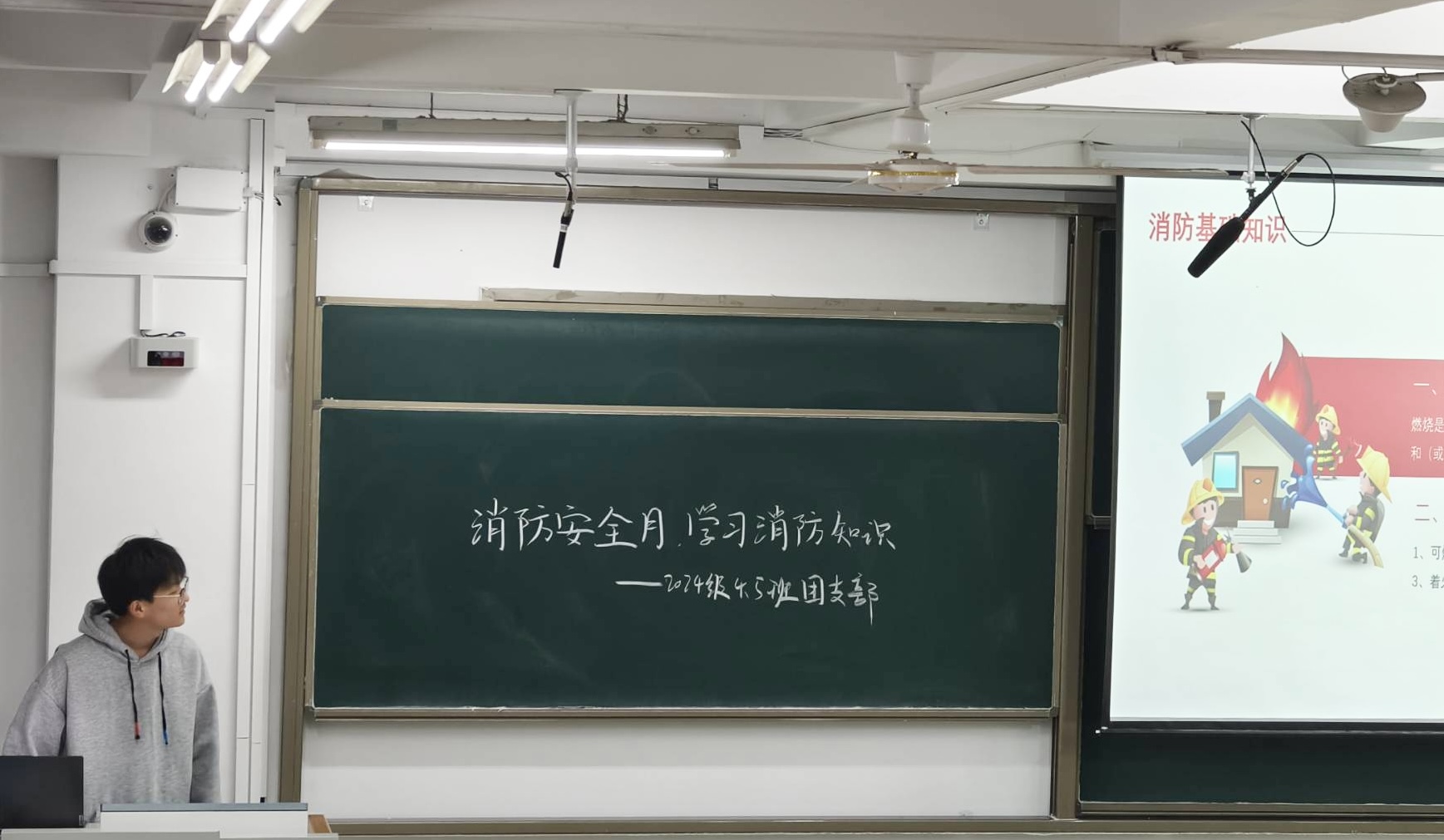 为进一步开展消防安全宣传工作,提高学生应急自救能力,11月5日,喷水 于11号教学楼A204教室举办消防安全月主题团日活动,由团支书李昱坤主持,2024级5班全体学生参加。