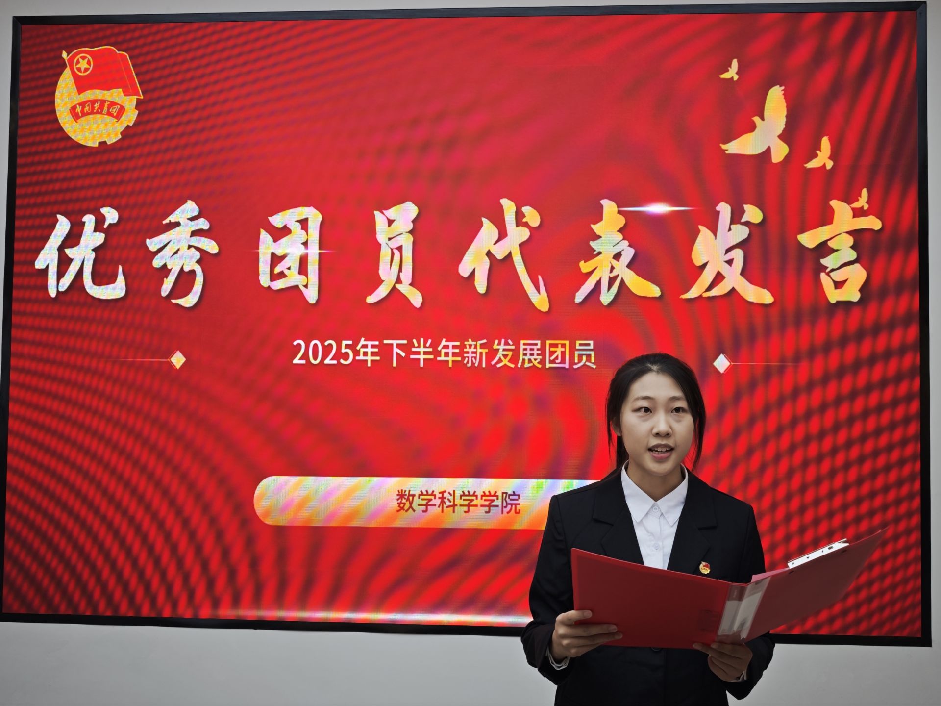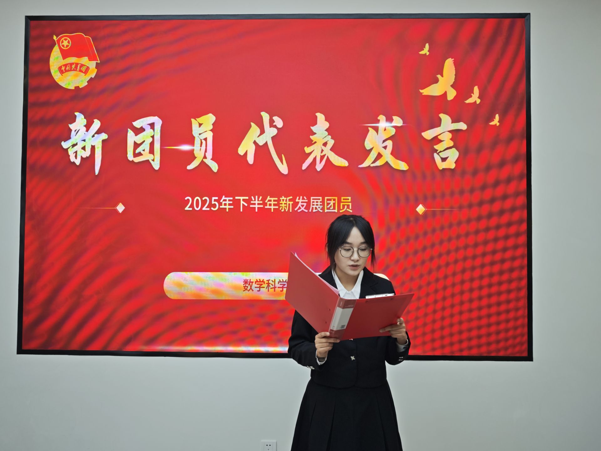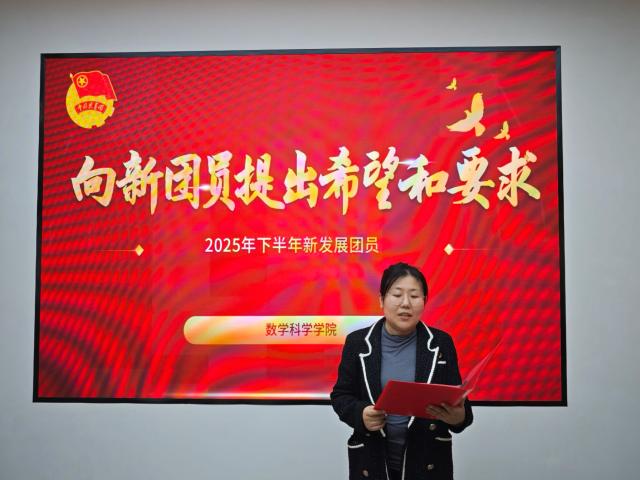 团委书记岳琳琳向新团员表示热烈祝贺,并提出四点希望和要求:一要筑牢信仰之基,勇担时代使命,牢记“党有号召,团有行动”的优良传统;二要锤炼过硬本领,争做学习先锋,以学习为第一要务,学好专业知识、营造优良学风;三要践行服务宗旨,彰显青年担当,提升自身形象;四要恪守品德准则,引领文明风尚,认真履行团员义务与责任,永葆进取之心。