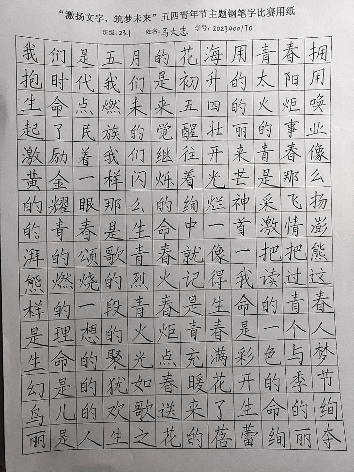 5月3日至5日,喷水 于线上举办“激扬文字,筑梦未来”五四青年节主题钢笔字比赛,2022级、2023级部分同学参加。