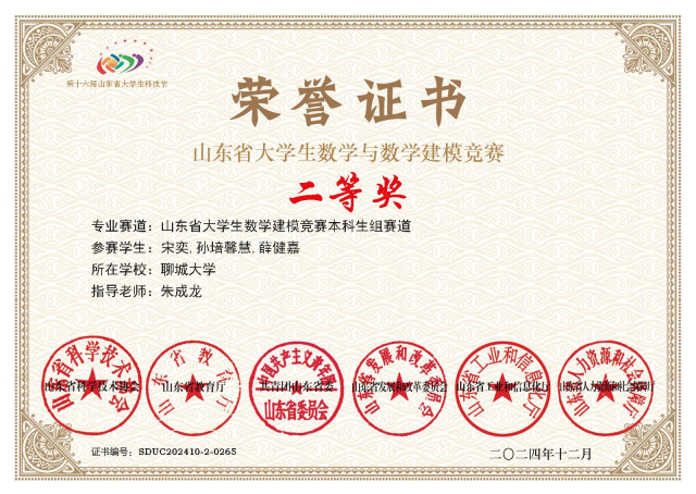 “不积跬步,无以至千里;不积小流,无以成江海。”宋奕始终秉持勤学笃行的精神,以扎实的学风和坚韧的毅力在学业道路上不断攀登,学分绩点与综测成绩稳居专业榜首,曾获山东省优秀学生、国家奖学金、校长奖学金等荣誉。在专业学习之外,她积极培养创新思维与实践能力,先后斩获“建行杯”第九届山东省“互联网+”大学生创新创业大赛省赛银奖、第十八届iCAN大学生创新创业大赛三等奖、山东省大学生数学建模竞赛二等奖等重要奖项,并在喷水 “润育梦想”创新创业就业训练营中获评优秀营员。
