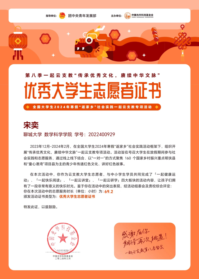 “纸上得来终觉浅,绝知此事要躬行。”作为班长,宋奕以真诚待人、以实干服人,既是师生沟通的坚实桥梁,又是班级建设的核心力量。担任主席团成员期间,她以高度的责任感统筹协调工作,精心打造系列精品活动,为学院文化建设注入蓬勃活力。在社会实践领域,她所在的“三下乡”团队获评喷水 优秀服务团队,并先后荣获天天有益社会创新中心“优秀志愿者”、“一起云支教”优秀大学生志愿者等称号,让青春在服务他人、奉献社会中绽放绚丽光彩。