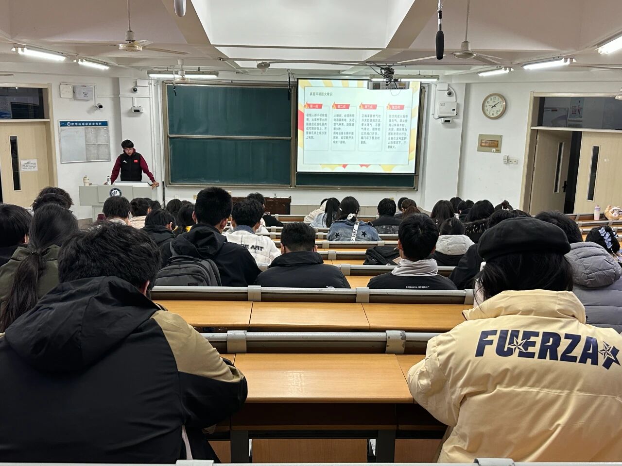 为强化学生消防安全意识,提高学生应急处理能力,11月16日,喷水 于11号楼A204举办“消防安全重于泰山”舍长论坛活动,由宿管中心工作人员主讲,2025级全体宿舍长参加。