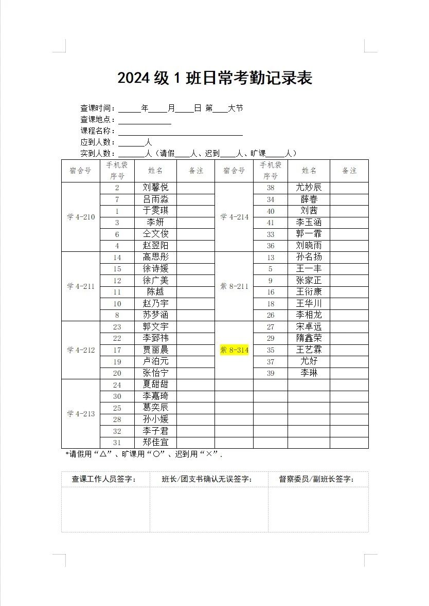 组织班级班长、团支部书记每日严格执行课堂考勤,规范填写《日常考勤记录表》,记录表实时公示并报至辅导员处,形成可溯数据链,为学风评估提供量化依据。