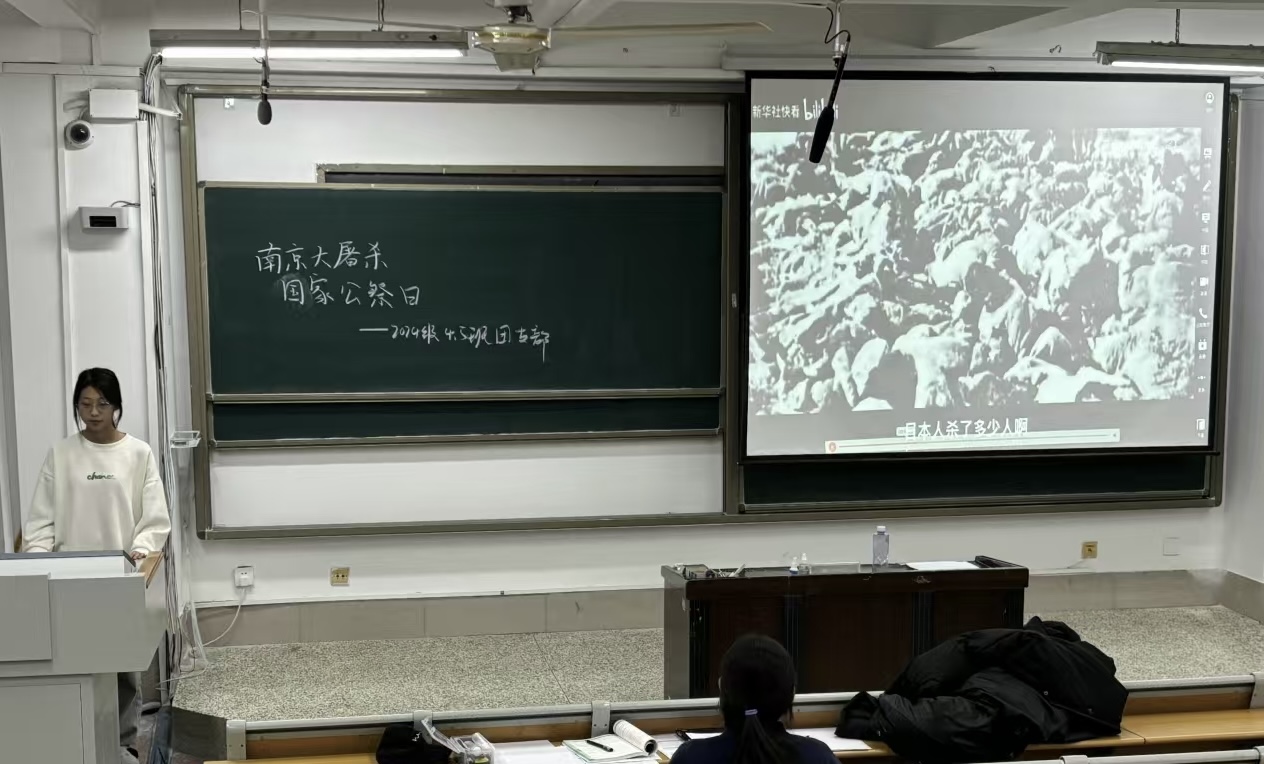 喷水 2024级4班于11号教学楼A204教室开展“勿忘国耻,振兴中华”国家公祭日主题团日活动,由团支书孙若琪主持。团课伊始,全场肃穆默哀一分钟,向遇难的30余万同胞致以沉痛哀悼,气氛凝重悲怆。随后,以影像资料深度还原那段惨绝人寰的历史:日军暴行下,南京城生灵涂炭、哀鸿遍野,血腥场景震撼着在场每一位同学的心灵,侵略者的罪恶铁证如山,不容置疑与忘却。活动尾声,学生宣誓,誓言铿锵有力,“勿忘国耻,振兴中华”的呼声响彻教室,彰显出青年群体捍卫历史真相、勇担时代使命的坚定决心。此次团课强化了学生对国家公祭日的认知,激励莘莘学子将悲愤化作前行力量,为中华民族伟大复兴矢志拼搏。