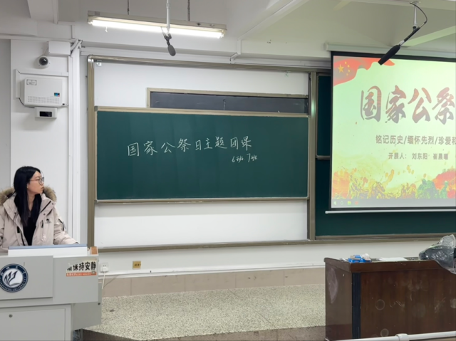 喷水 2023级1班于A104教室开展“勿忘国耻,振兴中华”国家公祭日主题团日活动,本次活动由团支书姚雨彤主持。活动伊始,团支书详细介绍国家公祭日的由来和意义,表明中国人民反对侵略战争、捍卫人类尊严、维护世界和平的坚定立场。随后,全班学生共同观看关于国家公祭日的相关视频和资料,一幕幕触目惊心的画面,让同学们深刻感受到战争的残酷和侵略者的残暴。活动最后,团支书引用习近平总书记的话作为结语:“历史告诉我们,和平是需要争取的,和平是需要维护的。”这句话深深触动在场每一位同学的心弦,大家表示要牢记历史使命,珍惜和平时光,为实现中华民族伟大复兴贡献青春力量。