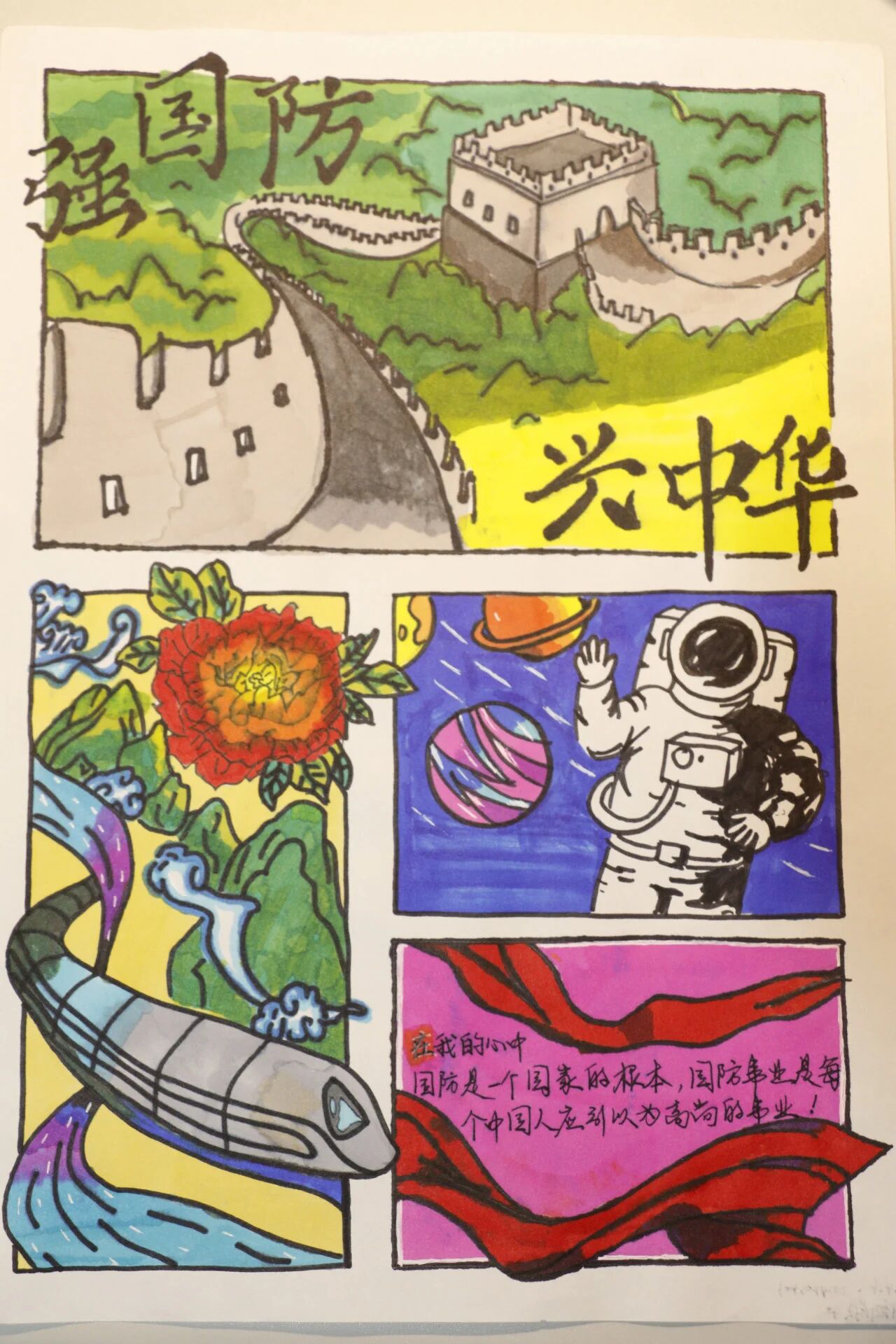 在创作过程中,参赛者认真查阅相关资料,围绕国防历史、现代军事科技、英雄事迹等主题展开创作,用手中的画笔描绘出心中的国防画卷,精心设计版面,力求将每一份手抄报都打造成兼具思想性与艺术性的佳作。色彩搭配上,有的运用浓烈的红色与深沉的蓝色,营造出庄重而热烈的氛围;有的则巧妙地使用绿色与黄色,展现出国防事业的生机与希望。绘画手法上,写实细致入微,将军事场景、军人形象刻画得栩栩如生;卡通则生动可爱,以幽默风趣的形式传播国防知识,这些手抄报不仅是艺术作品,更是同学们深入学习国防知识的成果展示。许多学生表示,通过参与此次活动,对国防知识有了更全面、更深入的了解,深刻认识到国防事业与每个人息息相关。