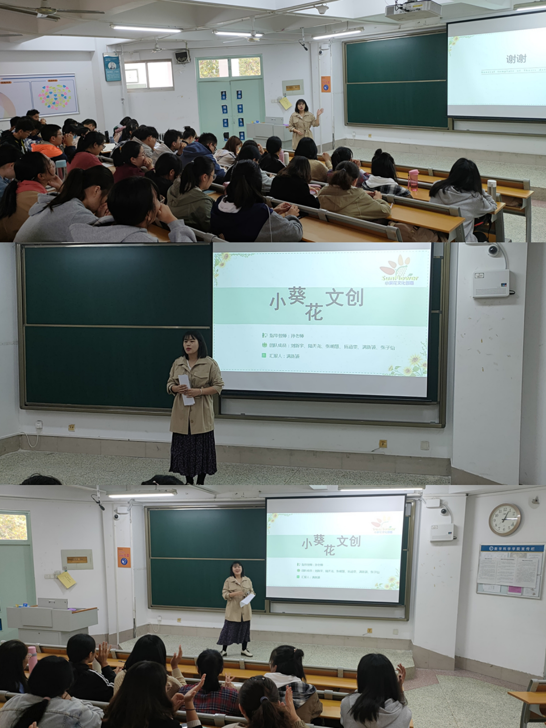 活动开始,孙云霞老师向同学们讲述了创业的经历与益处,并对其进行了客观的分析,从自己团队的经历引出创业计划书的要求:新颖、实用、经得起推敲。进而通过小葵花文化创意工作室项目的PPT,向学生们讲解了如何撰写创业计划书,以及创业的相关知识。孙云霞老师介绍到:需先从执行概要确定创业计划的方向与目标,并简述产业背景和公司概述。进而制定相应的市场实际调查与数据分析,对市场定位、客户进行预测和分析。确定需要的商业模式,财务分析和融资计划等等的与项目相关的策划,从而让参加此次活动的负责人更好的对自己团队的创业计划书进行进一步的完善和修改。随后,学生代表杨涵雯先向同学们讲解了文创的概念,并接着向大家介绍了小葵花文化创意工作室的相关信息,从是什么、做什么、怎么做等方面进行了分类讲解,活动也就此落下帷幕。