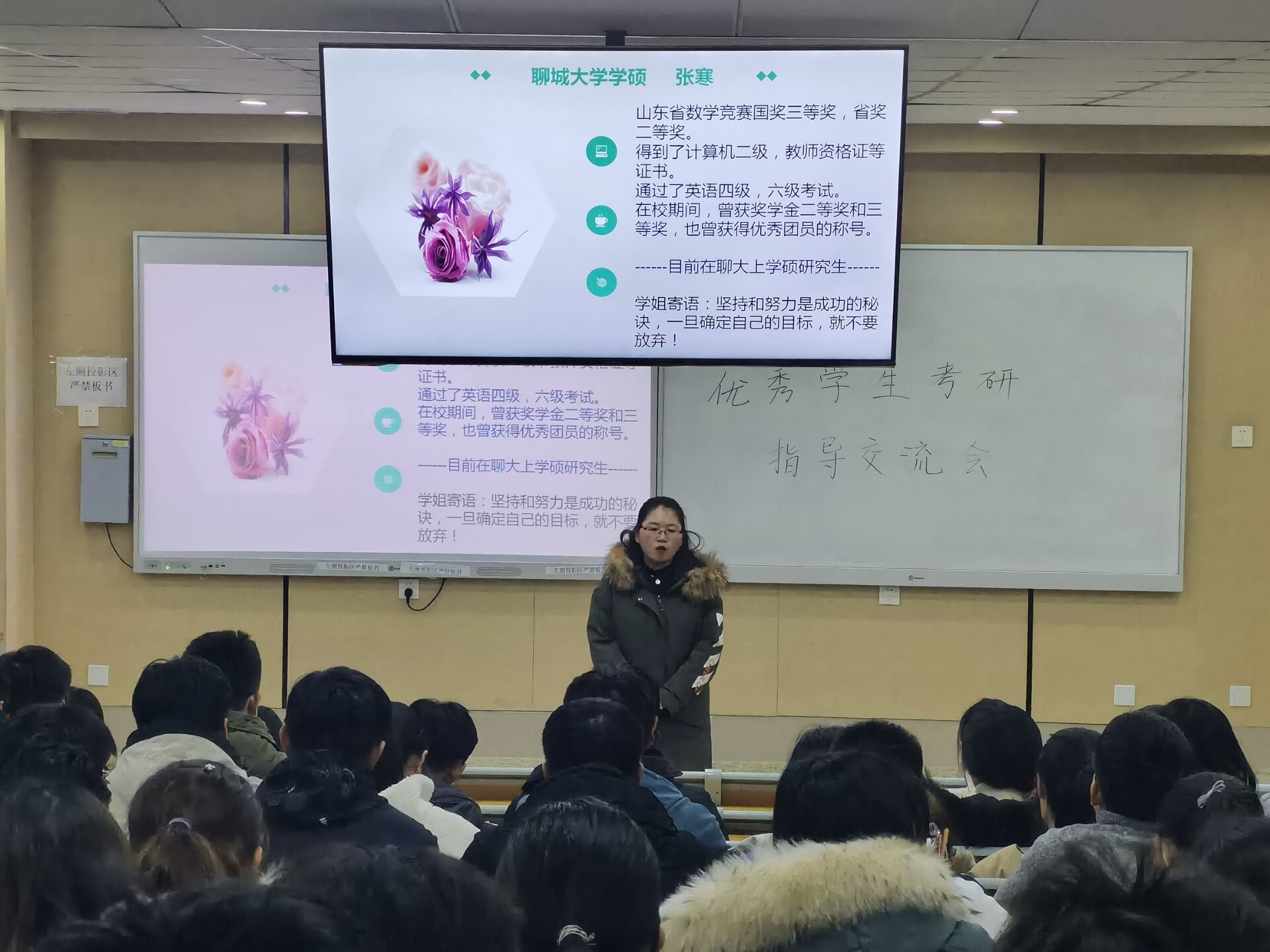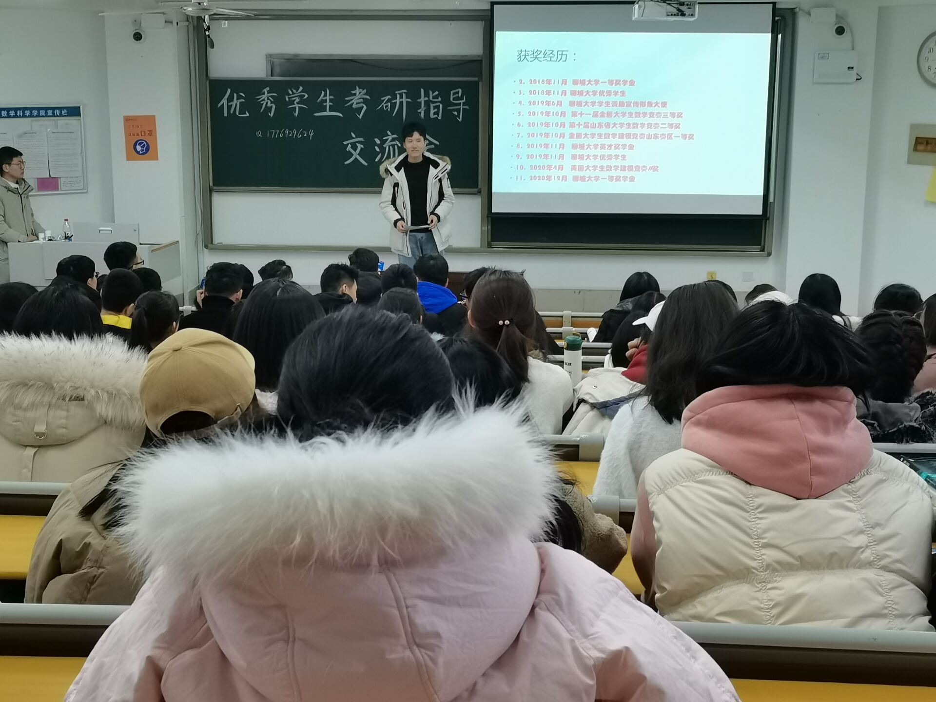 活动伊始,负责人首先对几位优秀毕业生的学位背景进行了简单的介绍,紧接着又对在场同学强调了此次活动的目的及其意义,听取他人的故事,能更好的丰富自己的大学生活。在热烈的掌声中,第一位优秀毕业生走上讲台。她脸上洋溢着自信的笑容,将自己与聊大的故事娓娓道来,她提到大学是一个不怕孤独的过程,考研之路更是如此,要坚定自己的梦想,在书籍中去寻找快乐;不必滥交好友,要交志同道合的朋友。她还提到了坚持与勤奋的重要性,所谓“星光不负赶路人”,即使求学路上荆棘遍布,只要永不言弃,就一定能收获丰硕果实。演讲者声情并茂,台下观众也沉浸其中,连连点头拿出本子认真记录。演讲者一个接着一个走上讲台,掌声一阵高过一阵。突然全场发出了赞叹声,未见其人也未听其声,只看见投影屏幕上跳动的字符,原来是最后一名演讲者达到了所有数学科目接近满分的成绩。在全体观众的热情欢呼下,此位毕业生为大家分享了自己的学习方法,幽默诙谐的语言加上适当的板书,使同学们沉浸在他的讲解中,也将此次活动推向了高潮。最后活动负责人对此次活动做了总结,并且对在场优秀毕业生的到来表示了诚挚的感谢,到此活动圆满结束。