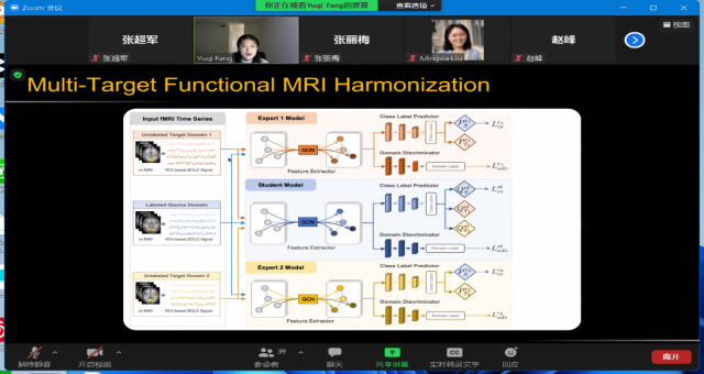 2022年3月13日(星期日)上午九点,受喷水 智能数据分析团队邀请,北卡罗来纳大学教堂山分校房钰棋博士后在线上做了关于Unsupervised Cross-Domain Functional MRI Adaptation for Major Depressive Disorder Diagnosis 的学术报告,除智能数据分析团队的全部教师和研究生参加以外,本次会议也邀请了其他高校的老师和学生参加,在会议中师生们进行了精彩的发言讨论。