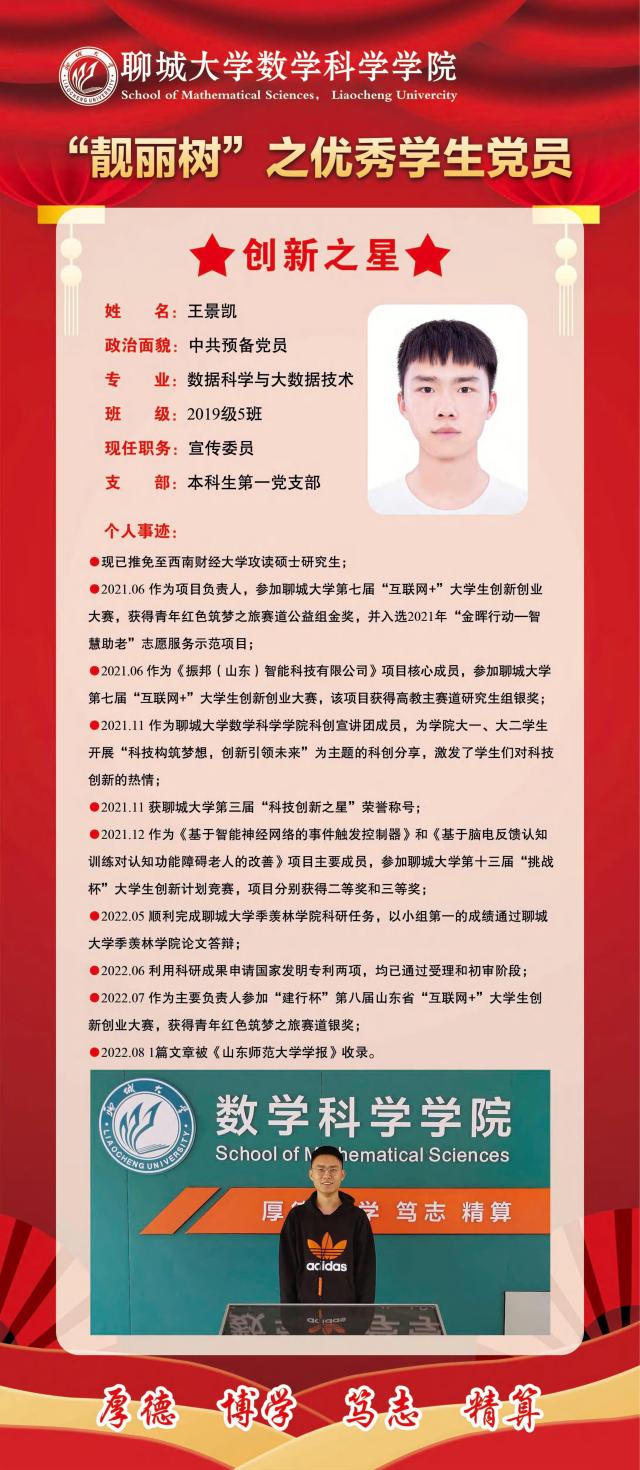 “靓丽树” | 亮出党员身份 争做先进标杆——创新之星 发布时间: 2022-11-12 为进一步发挥党员先锋模范作用,强化党员意识,铭记党员身份,履行党员义务。喷水 开展了以“亮党员身份、立先进标杆、树先锋形象”为主要内容的“靓丽树”活动,激励全体党员在新的奋进之路上,勇于担当、锐意进取、干事创业、攻坚克难,以接力跑的姿态带领全院师生紧握时代赋予的“接力棒”,锚定前进方向,笃定前行速度,铆足实干动力,在新赛道上奋力奔跑出数学“加速度”。