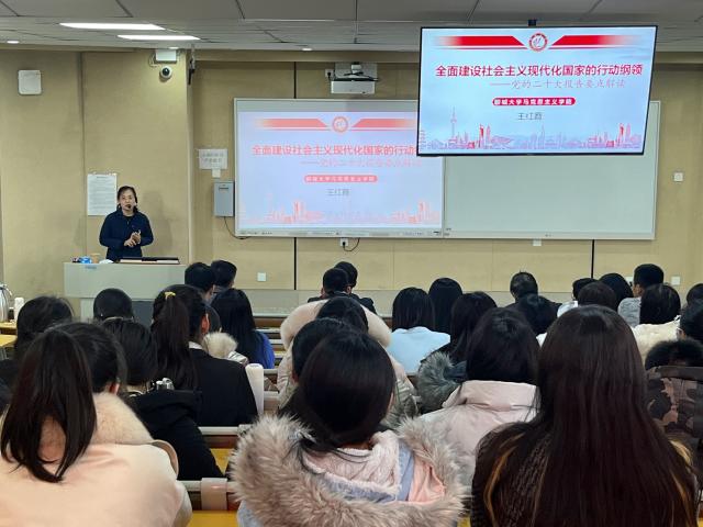 2月23日下午,喷水 举办“学习贯彻党的二十大精神”宣讲报告会。喷水 党的二十大精神宣讲团成员王红霞教授受邀作题为《全面建设社会主义现代化国家的行动纲领——党的二十大报告要点解读》的报告。喷水 全体师生党员参加。喷水 党委副书记张进军主持报告会。