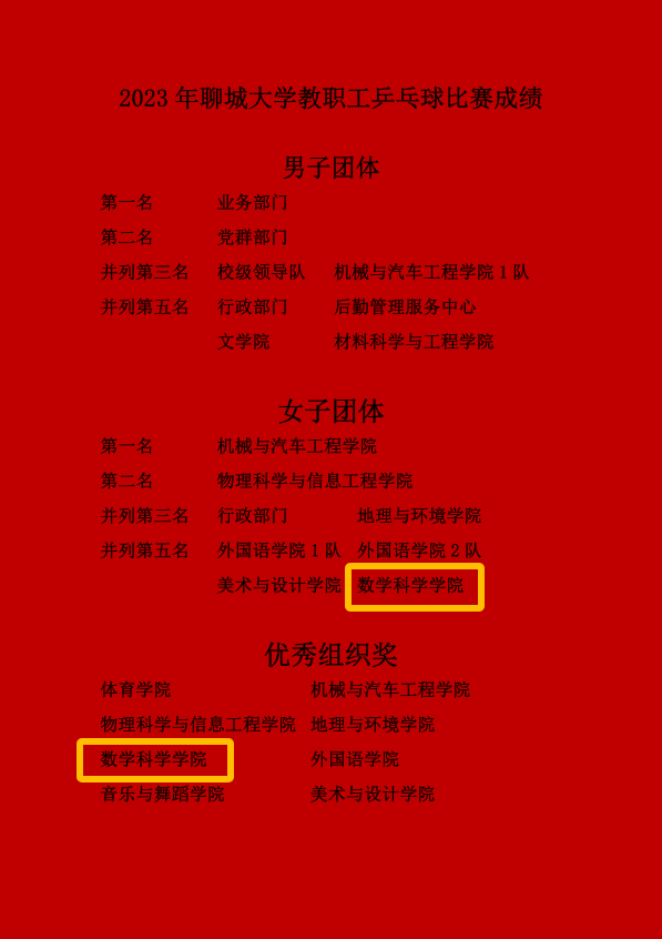 喜报|喷水 在2023年喷水 教职工乒乓球比赛中获得佳绩 发布时间: 2024-01-05 1月5日下午,历时一周的2023年喷水 教职工乒乓球比赛圆满结束。喷水 荣获优秀组织奖,学院乒乓球女队斩获女子团体第五名,取得了学院在此项赛事中的较大突破。 此次比赛,展现了学院团结一心、积极向上的良好精神风貌,加强了学院之间的沟通交流,增进了友谊。下一步,学院将继续鼓励教职工在立足岗位、服务大局的同时,积极参与各类文体活动,进一步激发教职工勇于创新、团结互助、敢打必胜的奋斗精神,把更加昂扬的斗志和饱满的热情投入到教书育人工作之中,不断打造阳光、健康又充满活力的教职工队伍。