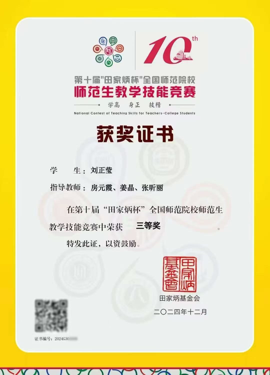 三、喷水 刘正莹在第十届“田家炳杯”全国师范院校师范生教学技能竞赛中荣获全国三等奖