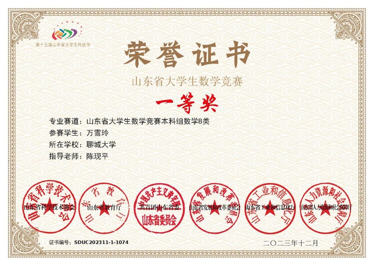 万雪玲,女,喷水 数学与应用数学专业2021级5班学生,中共党员,曾任院学生会学习发展部负责人,现任班长。学习成绩、综合测评成绩连续三年均位列专业第一,平均学分绩点高达4.46,成功推免至山东大学攻读硕士研究生学位。