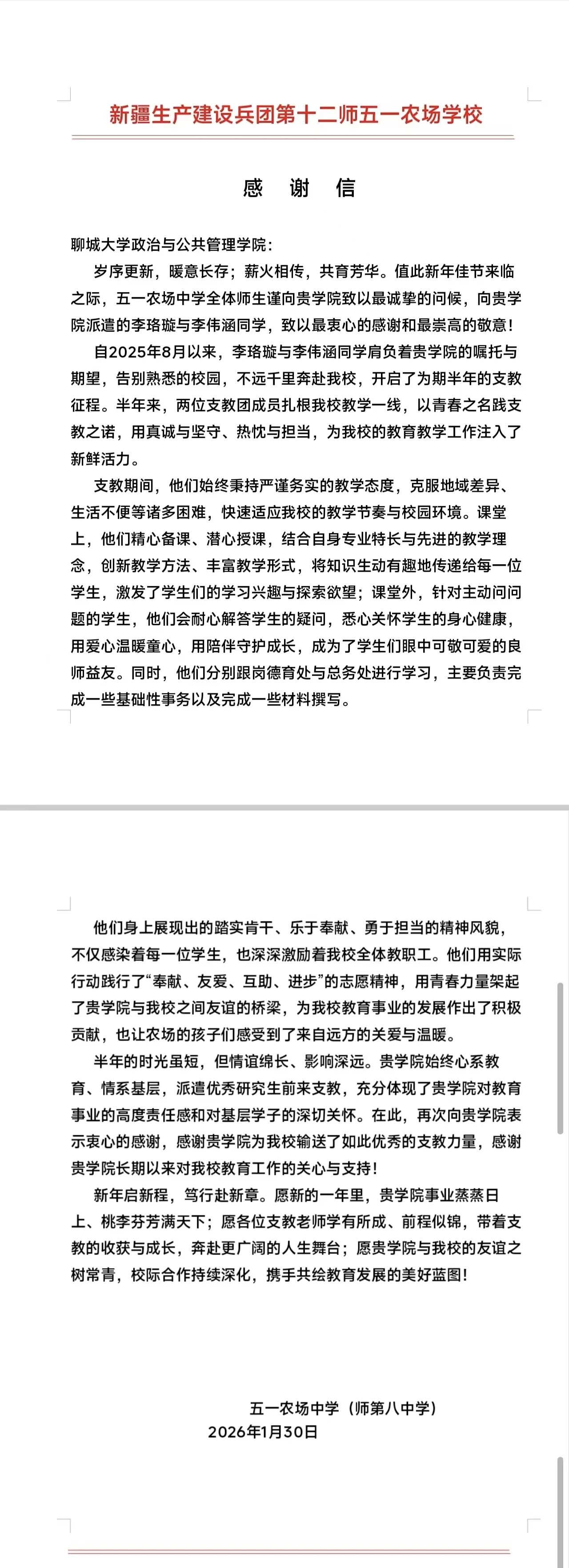 英吉沙服务队9名志愿者凭借在援疆支教期间的突出表现,被所在学校授予“优秀支教教师”荣誉称号。一本本鲜红的荣誉证书,不仅是对志愿者们个人辛勤付出的肯定,更是鲁疆情深的生动写照。半年来,英吉沙服务队的志愿者们克服恶劣气候、远离家乡等诸多困难,迅速融入当地教学环境,主动承担毕业班教学任务,创新教学方法,志愿者所带班级学业成绩均显著提升。他们积极参与“青蓝工程”师徒结对,与当地教师互学共进,利用周末时间开展家访,深入学生家庭了解情况,用真情温暖每一个孩子的心田。“这份荣誉属于我们整个团队,更属于所有关心支持援疆事业的聊大人。”手捧证书,志愿者们纷纷表示,将把这段宝贵的支教经历化为前行的动力,继续在各自岗位上发光发热,为促进民族团结、服务西部教育事业发展贡献青春力量。